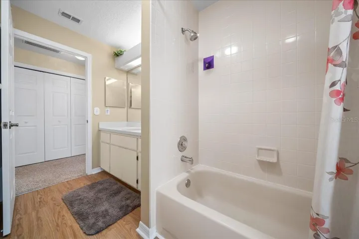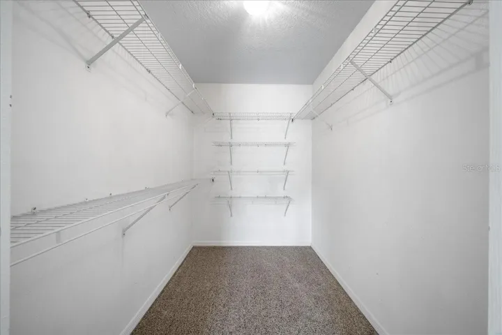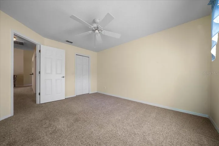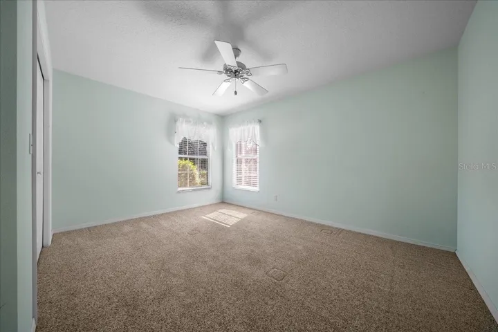 The spacious owner’s suite is a true retreat, featuring a large walk-in closet, additional walk-in linen storage, and direct access to the lanai. The en-suite bathroom includes dual sinks, a tiled shower, and a private water closet for added comfort.
