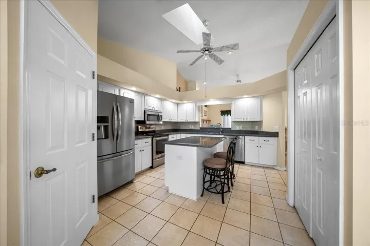 Inside, the home offers a thoughtfully designed layout with a formal dining room and a covered lanai, providing multiple spaces for hosting family and friends. The kitchen is the heart of the home, complete with a center island, abundant cabinetry, stone countertops, and a pantry—perfect for both everyday living and entertaining.