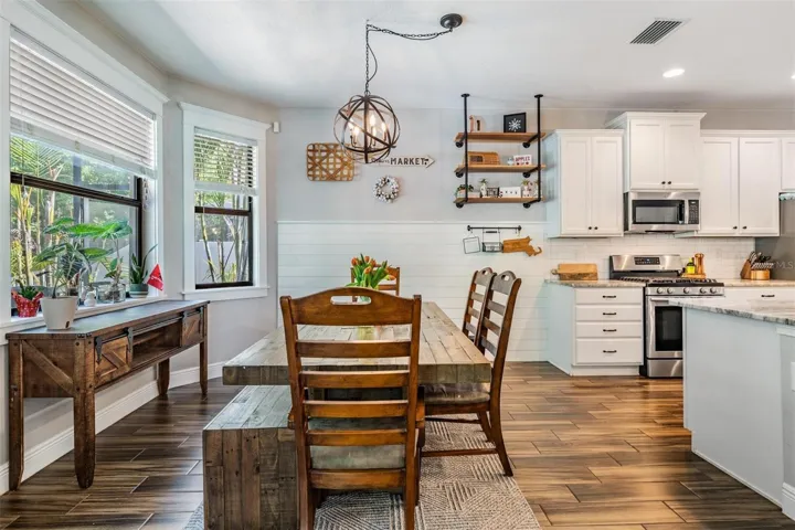 From the moment you walk through the leaded-glass front door, you’re welcomed by an open, light-filled floor plan with plank tile flooring and designer touches throughout. The kitchen is the heart of the home, featuring granite countertops, solid wood 42” cabinetry, gas range, subway tile backsplash, and a large island that flows seamlessly into the spacious family room, ideal for entertaining or everyday living.