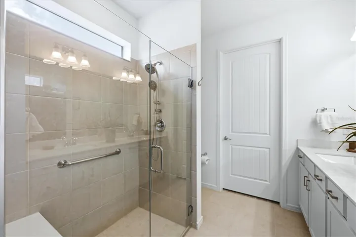 The Compass floor plan is perfect for either full-time or seasonal residents! A two-car garage allows room for a golf cart and a car or 2 full-size cars plus a utility sink and storage. The two bedrooms are split, and the den has room for a Murphy bed or sleeper sofa plus desk. But it’s the open floor plan that will have you saying Yes to this home. The seller loved the expansive quartz-topped island and the chef-designed kitchen. Lots of pull-outs and under-island drawers and a kitchen sink with an expansive view of blue skies and green conservation. The seller selected all the best things- surround sound, 8 ft doors, KitchenAid appliances, top-tier cabinets and countertops and porcelain wood look tile almost everywhere (guest bedroom has carpet). The extended screened lanai is the perfect size for your Florida lifestyle and has an outdoor TV in place. The HOA includes internet and streaming TV, grounds and tree maintenance. Del Webb Bay View is a gated 55+ community with a fitness center, club rooms, bocce, tennis, pickleball, lap pool, resort-style walk-in pool with a bar/restaurant on site, dog parks and a community garden! There are too many clubs to mention; you can be as busy as you want to be in Bay View. A golf cart is available for purchase outside of purchase contract. Do note that the CDD fee is included in the taxes shown. Community is located 1.5 miles from I-75 making travel anywhere, easy.