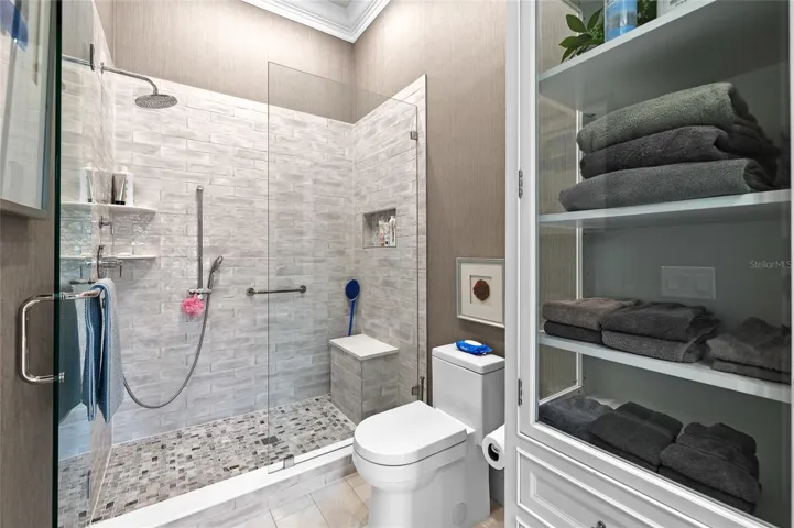 The main level features a versatile guest suite or private study with a full bath that also functions as a pool bath. Soaring 11’4” ceilings and substantial crown molding enhance the home’s grand scale while maintaining a warm, livable feel.