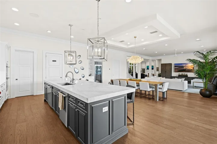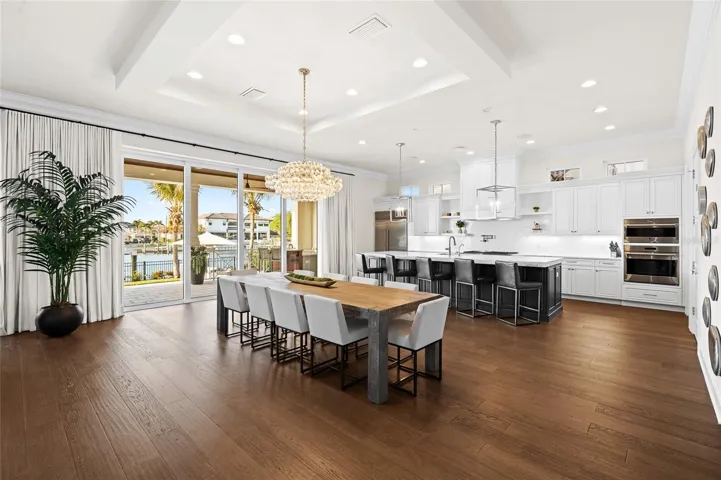 Designed to embrace the very best of waterfront living, the expansive open-concept floor plan seamlessly blends refined elegance with everyday functionality. The chef’s kitchen serves as the heart of the home, overlooking the dining and family areas—perfectly suited for both intimate gatherings and large-scale entertaining. Outfitted with top-of-the-line appliances, including dual Asko dishwashers, a 48” Sub-Zero refrigerator, full Sub-Zero wine storage, and a 48” Wolf gas range with dual ovens, along with an additional Wolf wall oven and microwave, every detail has been thoughtfully curated. Custom cabinetry by Brian Castor and exquisite stone countertops complete the space with timeless sophistication.