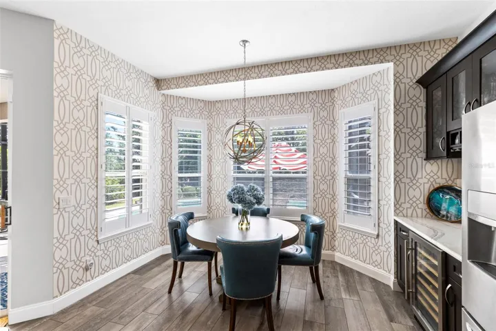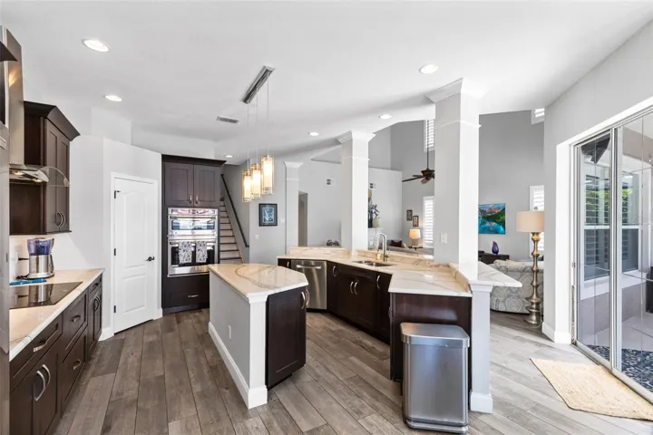 Formal living and dining rooms offer sophisticated spaces for entertaining, while the open kitchen flows into a two story family room and dinette, all overlooking the solar heated pool for seamless indoor outdoor living.
