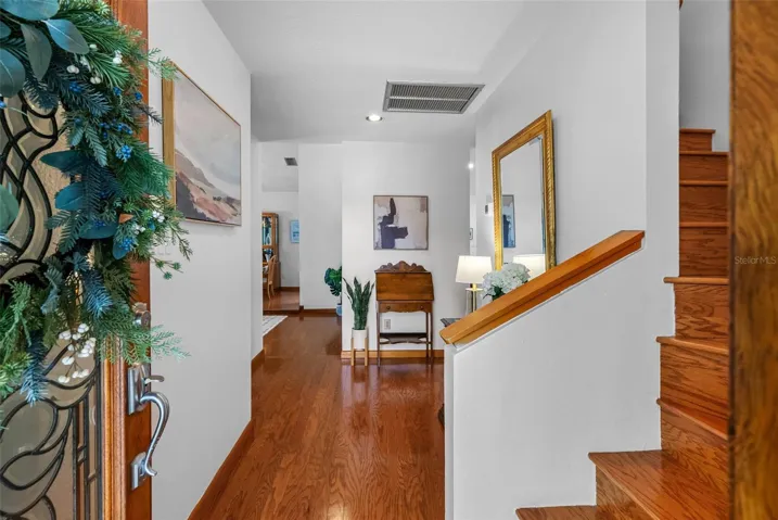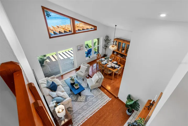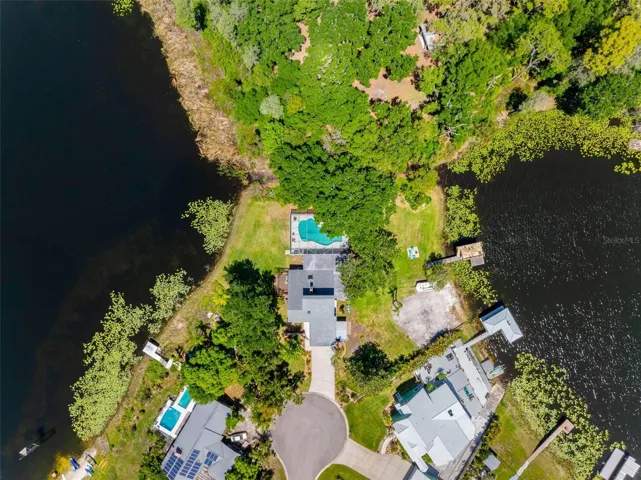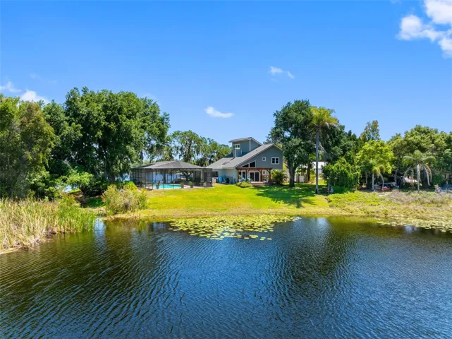 Welcome to “House of Views” — a truly one-of-a-kind waterfront retreat perfectly positioned between Little Moon Lake and Rainbow Lake, offering breathtaking water views from nearly every room. Nestled on a private cul-de-sac with over half an acre, this property features a beautiful beach area on Rainbow Lake and serene conservation land behind, owned by the Boy Scouts and preserved for privacy and natural beauty. This 3-bedroom, 3-bath home offers 2,723 square feet of thoughtfully designed living space. Upon entry, engineered hardwood flooring flows through the main living areas, complemented by soaring vaulted ceilings that fill the formal living, dining, family room, and kitchen with natural light. The formal spaces open to a pergola-covered deck overlooking the peaceful waters of Little Moon Lake. The updated kitchen features cherry wood cabinetry, granite countertops, and stainless-steel appliances, with a breakfast bar that overlooks the dinette area. Sliding glass doors lead to an oversized covered lanai and screened pool area—perfect for entertaining—with a built-in bar, sink, and beverage refrigerator. Relax in the pool while surrounded by tranquil water views, creating a true resort-style experience. A spacious 15’ x 22’ Florida room offers flexible space for a game room, office, or playroom, all with views of Rainbow Lake and your private dock—ideal for enjoying water activities. Plus, the 4th bathroom complete with walk-in shower with access as the “pool bath.” The first floor also includes a guest bedroom and full bath with walk-in shower. Upstairs, the primary suite showcases vaulted ceilings and stunning lake views, along with a private deck—perfect for morning coffee. The suite includes a custom walk-in closet and a luxurious bath with dual vanities, garden tub, walk-in shower, and granite countertops. An additional upstairs bedroom and full bath complete the layout. Additional features include a two-car garage with ample space for water toys and outdoor gear. This nature-filled property offers frequent sightings of birds including waterfowl and herons, rabbits, wild turkey, and deer. Conveniently located near the Veterans Expressway, downtown Tampa, Tampa International Airport, International Plaza, dining, medical facilities, and just minutes from the Gulf Coast’s beautiful beaches and Tarpon Springs home of the sponge docks. This home offers the perfect blend of tranquility and accessibility. Don’t miss this rare opportunity to own a true waterfront sanctuary.