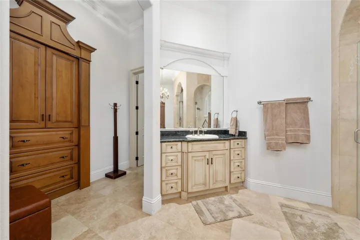 Perfection has an address along with comfortable Florida living. Located on the 17th fairway of Jack Nicklaus-designed Golden Bear Club’s golf course, this stunning home offers 5 bedrooms with the master on the 1st floor, 5 full baths, 2 half baths, home theatre, game room, office, and 2nd floor gathering room overlooking a stunning balcony. Invest in quality in this Rick Watson built masterpiece offering a detailed office with coffered ceiling and built-ins, gourmet kitchen with Wolf appliances, and an abundance of custom features. Come experience the peaceful setting of this lovely home with a beautiful view of the golf course and the perfect floor plan for entertainment with its integrated sound system all over the house. An expansive master suite offers lanai access, two spacious walk-in closets with custom organization system, a spa-like bath with stone-top jetted tub, a travertine-covered wrap around walk-in shower with multiple shower heads, and separate vanities. Year-round outdoor activity is possible on the lanai with a summer kitchen and generous outdoor living space that includes covered seating areas, a gas fireplace, space for an outdoor TV, and a gorgeous pool and spa. Watch cinematic masterpieces in your very own home theater, or host game nights in your very own game room with a wet bar diso style. Additional Features include but are not limited to: 5 A/C units with an upgraded air filtration system, a stone-paver driveway, an over-sized 3-car garage, elegant landscaping, and a hand crafted wood and iron front door. Located within 24-HR guard gated Keene’s Pointe and zoned for top-rated schools, this home is a true pleasure to experience.