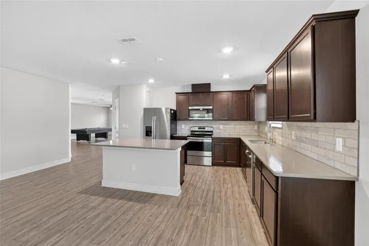 The open-concept layout is enhanced by beautiful wood plank flooring throughout, with carpet only in the second bedroom for added comfort. The kitchen provides ample cabinet space, and the home also includes a two-car garage for added convenience.