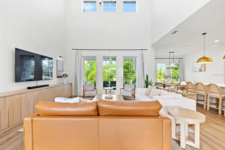 The main living space makes an immediate impression with soaring ceilings—reaching approximately 20 feet—and an open-to-below design that connects to the upstairs walkway. It brings in natural light and gives the home a sense of scale you don’t typically find at this price point.