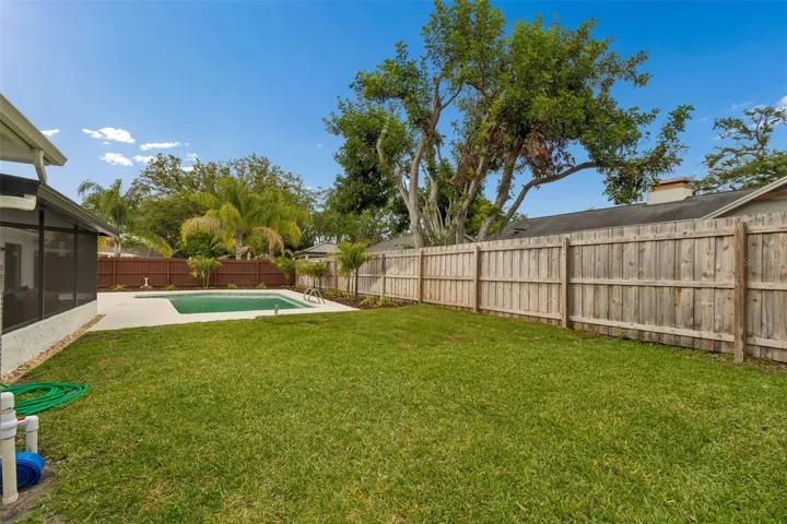 The renovated pool, Kool deck, and new screened patio (2026) create a true backyard oasis, complemented by fresh exterior paint and a full landscape refresh. A restored cedar trellis, new siding, and original architectural details tie the home’s classic Carrollwood character to its fresh, modern updates.