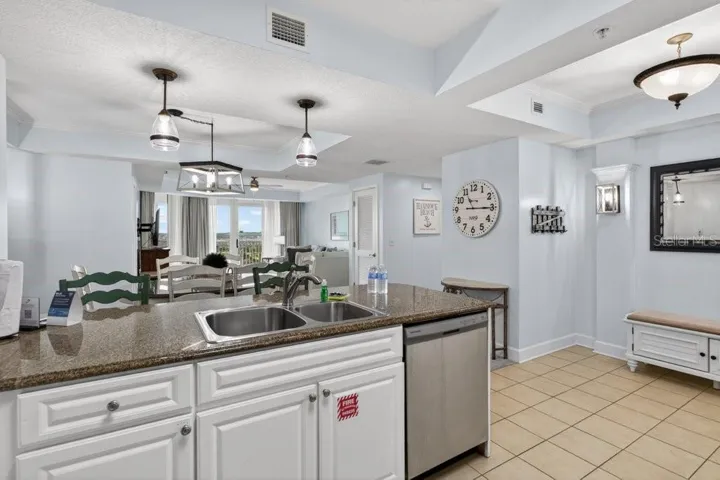 From your private balcony, enjoy an elevated vantage point with expansive ocean views, a peaceful outlook over lush palms and resort grounds, and a shaded seating area ideal for morning coffee or unwinding at the end of the day. Inside, the home opens into a light-filled, open-concept living space designed for effortless entertaining. The layout flows seamlessly from kitchen to dining to living room, with large sliders that frame both coastal and golf course views, creating a bright and inviting atmosphere.