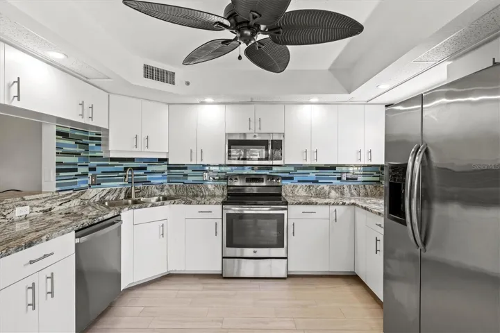 The interior is thoughtfully updated with light porcelain tile flooring throughout, a neutral color palette, and three sliding glass doors in the dining area that create a bright, airy feel while showcasing the picturesque surroundings. The kitchen is designed for both style and function, featuring white cabinetry, granite countertops, a tile backsplash, stainless steel appliances, and an island that opens to the main living space – perfect for entertaining.