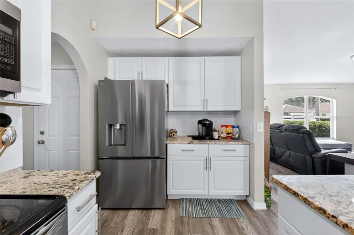 Inside, you’re welcomed by an open floor plan with vaulted ceilings and abundant natural light pouring in through double sliding glass doors, creating seamless indoor-outdoor living and offering stunning pool views from multiple areas. This turn-key 4-bedroom, 2-bath home has been thoughtfully updated with waterproof laminate flooring, modern lighting, and a fully renovated kitchen featuring granite countertops, a cooking island, new cabinetry, a 2023 dishwasher, and a 2023 refrigerator.