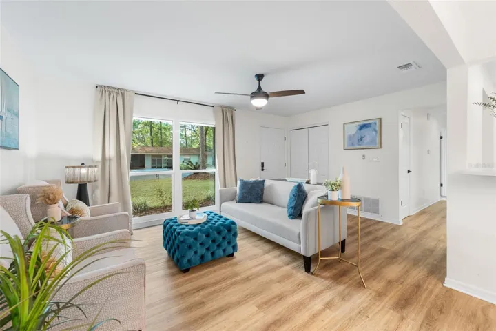 Fully remodeled in the last few years, this move-in ready 3 bedroom, 2 bathroom home in Northwest Gainesville showcases modern upgrades, timeless design, and an unbeatable location near top schools, shopping, and major employers including the University of Florida, UF Health, and the Malcolm Randall Veterans Affairs Medical Center. Zoned for and walk to Norton Elementary and ideally positioned for easy commuting, this home features NEW windows, 2024 HVAC, newer water heater, and a 2022 roof for peace of mind. Natural light pours through oversized picture windows, highlighting luxury vinyl plank flooring throughout with no carpet. The fully updated kitchen is designed for both function and style with quartz countertops, a large island, stainless steel appliances, designer herringbone laid backsplash, and a window overlooking the fully and newly fenced, spacious backyard. Both bathrooms have been thoughtfully renovated with designer tile, shower niche, premium fixtures, and modern vanities. Additional highlights include an interior laundry room with built-ins, washer and dryer included, and a storage shed that conveys as is. No HOA. Schedule your private showing today.
