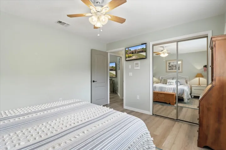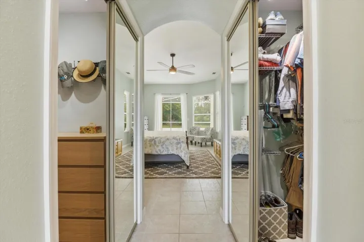 The primary suite is a private sanctuary, offering a spa-inspired bath with a soaking tub, separate walk-in shower, and dual walk-in closets designed for both comfort and organization. Sliding glass doors extend the living space outdoors to an expansive lanai and pool area—an inviting retreat for quiet mornings, sunset cocktails, or weekend entertaining. A discreetly placed fenced dog run adds a thoughtful touch for pet lovers.