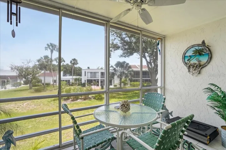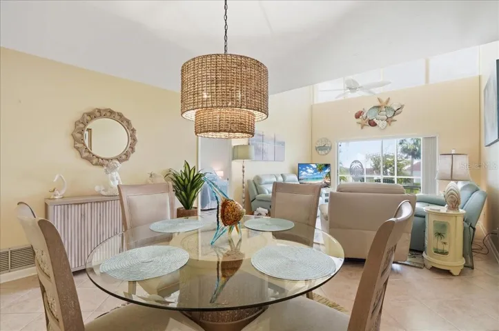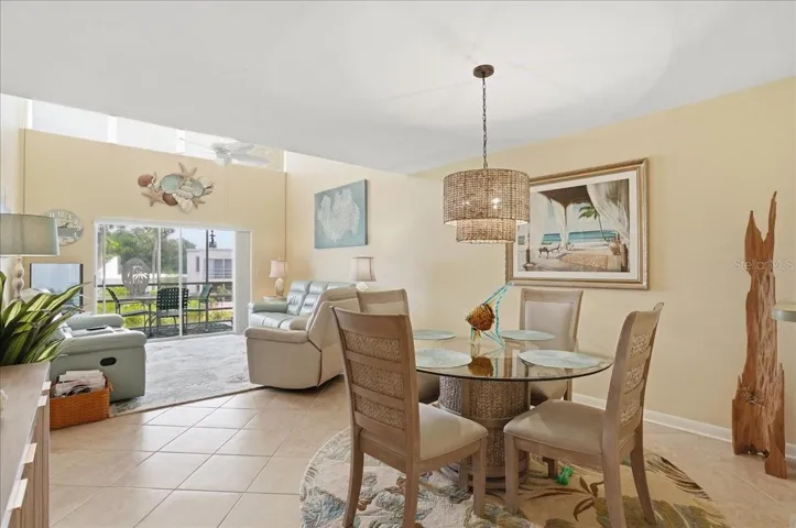 Welcome to your home in Capri West, Venice FL! Convenient to all types of shopping and to downtown historic Venice! Enjoy the views from your front door porch with golf views in the distance and back lanai overlooking the community landscaping and a view of the community pool to the left. Kitchen with convenient stackable laundry machines built into a closet. Living room dining area combination with very high vaulted ceilings which makes this home feel very grand! Primary bedroom with large walk in closet with an en-suite with new vanity, mirror and fixtures. Plus a second bedroom suite with its own ensuite with a new vanity, mirror and fixtures. A large walk-in close in the second bedroom for extra room for storage. Impact windows is a peace of mind feature. Come enjoy your Florida home at its best. 55+ community but one 1 owner only needs to be of age. 1 pet restriction. Come schedule a tour to enjoy this perfect retreat.