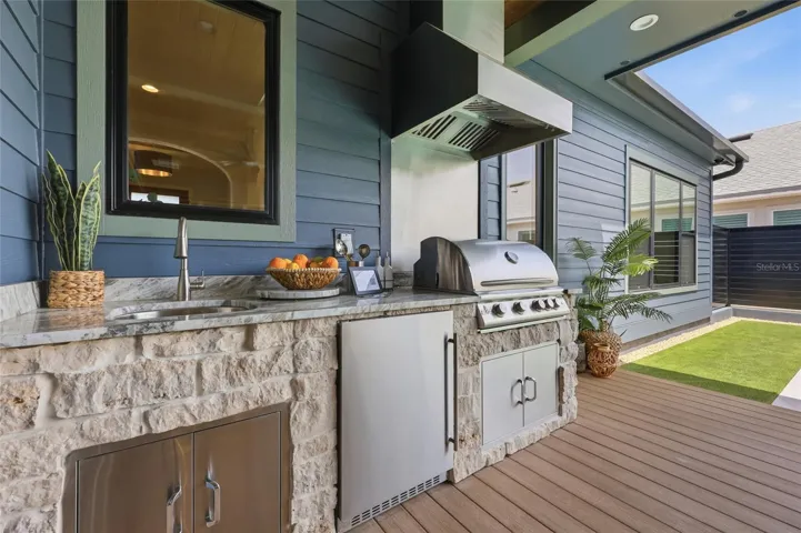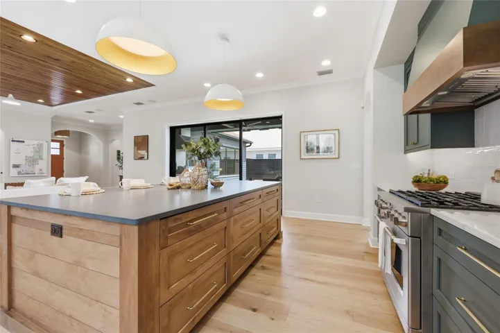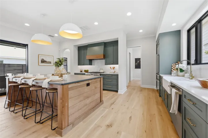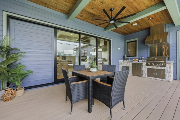 Designed with both luxury and livability in mind, the home features natural limestone veneer accents, stained wood tongue-and-groove porch ceilings, TimberTech decking, a turf courtyard, and a saltwater pool—all creating a private outdoor retreat. Inside, French white oak engineered flooring runs throughout, complemented by custom wood closet shelving and thoughtfully selected finishes.
