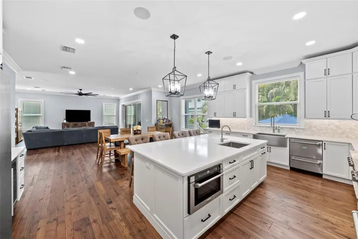 At the heart of the home is a true chef’s kitchen, complete with a large gas range, oversized fridge, custom cabinetry, and an oversized island that