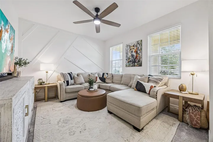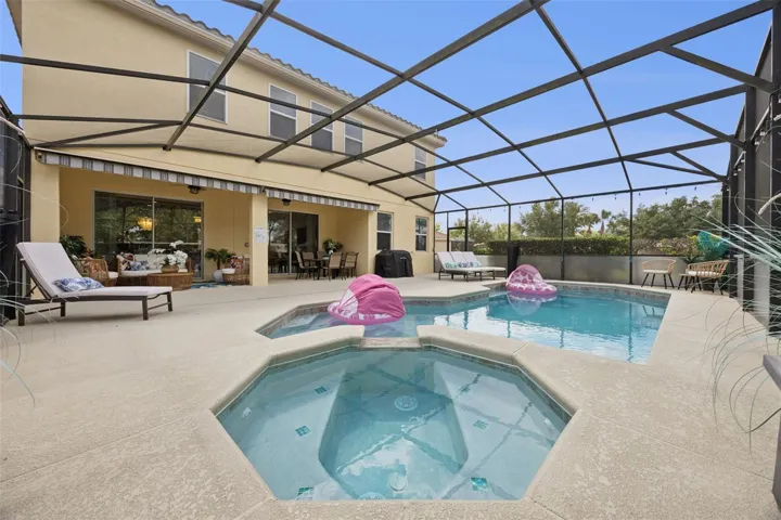 Welcome to Your Dream Home in Solterra Resort! Nestled within the prestigious, guard-gated community of Solterra Resort, this exceptional house offers a rare gem on a nearly 1/3 acre lot, ensuring unmatched privacy with no rear neighbors. This stunning property serves as both an exquisite primary residence and a lucrative short-term rental investment opportunity. As you step into the expansive backyard, prepare to be captivated by one of the largest outdoor spaces in the community, designed for your ultimate enjoyment. The magnificent oversized pool glistens under the sun, while the raised heated spa with its tranquil spillover water feature beckons you to unwind. The generously sized pool deck is amazing, and the luxurious lanai, adorned with two Sunsetter brand remote-controlled retractable awnings is your personal oasis for relaxation and entertaining. Inside, the home exudes elegance with its beautifully recent remodeled kitchen that boasts a harmonious blend of new cabinets and a chic combination of granite, quartz, and marble countertops. The oversized island makes it an entertainer’s paradise, where culinary creativity comes alive. With spacious rooms designed for leisure, two downstairs bedrooms provide flexibility for family or guests, while an additional lounge area adds to the home’s versatility. Venture upstairs to discover the serene primary bedroom, featuring a spacious east-facing balcony. The upstairs living room, flanked by three additional en suite bedrooms, offers a perfect sanctuary for family and friends. Living in Solterra Resort means embracing a vibrant lifestyle enriched with amenities. The spectacular clubhouse features a heated resort pool with a thrilling slide and beach entry, a lazy river pool, and well-maintained tennis and pickleball courts. Enjoy a workout in the fitness center or dine leisurely at the on-site café with both dine-in and take-out options. For sun-lovers, furnished rental cabanas and a sand volleyball court enhances the community’s allure. When you’re ready to explore beyond the community, you’re just 20 minutes from Disney and a mere 7 minutes from an array of dining and shopping choices. This impeccably maintained property invites you to experience a luxurious lifestyle in one of the most sought-after locations in Central Florida. Experience the Solterra Lifestyle Today! Don’t miss your chance to own one of the most beautiful and well-cared-for homes in Solterra Resort. Schedule your private showing and embrace the unparalleled charm and comfort this exceptional property has to offer!
