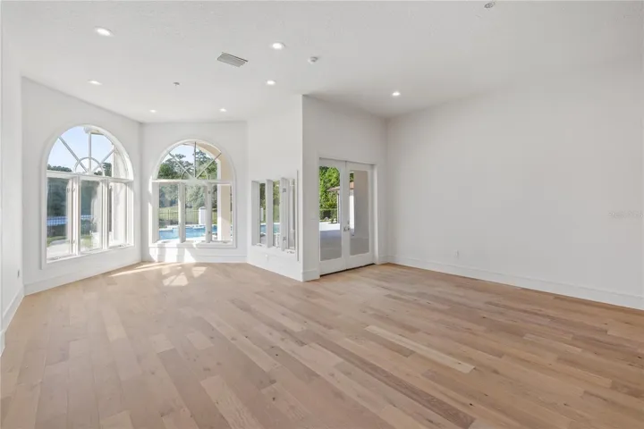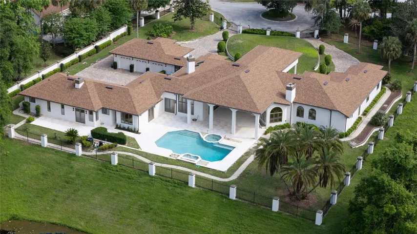 At the end of a quiet cul-de-sac and backing to the protected beauty of Wekiwa Springs State Park, this extraordinary waterfront estate offers a rare blend of privacy, scale and natural serenity in the desired Markham Woods Corridor. Fully fenced and positioned to capture sweeping conservation and water views, the setting alone places this residence in a category few can match. Impressive private gates and a brick paver circular drive introduce a dramatic arrival, where a grand porte-cochere and expansive six-car motor court set the tone. Inside, the home has been completely reimagined through a comprehensive renovation, unveiling soaring ceilings, walls of glass and abundant natural light. A striking 5-by-8-foot pivot door opens to a refined foyer with porcelain tile and white oak flooring, immediately drawing the eye to the shimmering pool and tranquil pond beyond. Designed for grand entertaining and effortless living, the main areas unfold in a seamless open-concept layout. With 14-foot ceilings and expansive living, dining, family and kitchen spaces flowing together, the home offers impressive volume and connectivity. Anchoring the heart of the home, a dramatic double-sided wood-burning fireplace creates a warm focal point between kitchen and family room. The chef’s kitchen is a showpiece, featuring Wolf appliances, built-in refrigeration and an oversized island with seating for six, finished with elegant waterfall-edge countertops. Outdoor living is equally captivating. A vast travertine lanai transitions to an oversized resort-style pool, all set against a breathtaking backdrop of water and untouched conservation. Nearly every room is oriented to capture these remarkable views, creating a constant connection to the landscape. The primary suite is a sanctuary of grand scale, offering serene water and wooded vistas. Its bespoke bath features leather-finished stone countertops, dual vanities, a soaking tub, and picture windows framing the natural setting. A spa-inspired steam shower with multiple shower heads and a built-in bench completes the experience. Dual custom walk-in closets elevate functionality, one with a center island and scenic window, the other concealing a hidden safe room. Versatility defines the additional spaces. A dedicated office with walk-in closet and direct bath access can serve as an additional bedroom. A generously sized bonus room is ideal for a home theater, library or lounge, while a separate gym with luxury vinyl flooring can easily function as a second office. A thoughtfully positioned flex space between the main residence and guest quarters opens to the lanai and pool bath, ideal for a cabana lounge or wellness retreat. The guest quarters is a residence unto itself, featuring two bedrooms, two baths, a spacious great room, full kitchen with center island, separate motor court access, and its laundry, offering exceptional accommodations for guests or multigenerational living. Homes of this caliber rarely come to market. The extensive renovation, remarkable scale, and exceptional attention to detail are paired with Seminole County’s desirable locations. Zoned for top-rated schools and ideally positioned near Longwood and Lake Mary, with convenient access to major highways, regional hospitals, airports, beaches and Central Florida’s world-renowned attractions, this is a legacy property that defines elevated Florida living.
