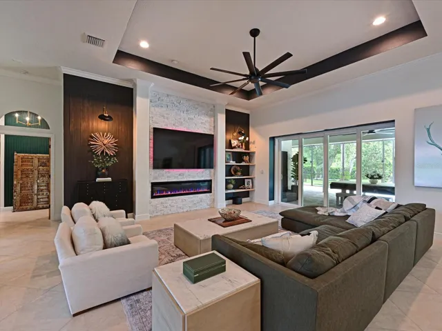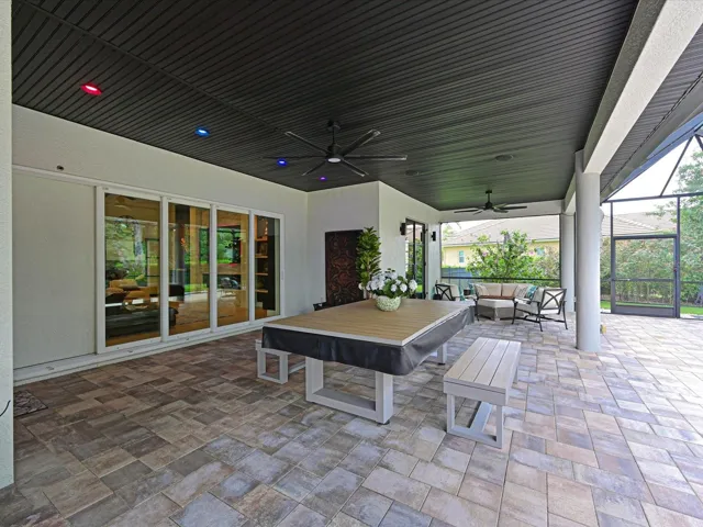 Built in 2016 by McKenzie Homes with 3,166 sq ft of living space. This single-level residence offers 3 bedrooms, 3 bathrooms, plus a den and game room/office (with a private bath) Den has new iron sliding doors with frosted glass. Great room has 4 sliders that pocket and open to the covered lanai. Spacious laundry room with granite counters, utility sink, and newly expanded storage cabinets. The home has been freshly painted inside and out and includes new lighting fixtures, ceiling fans (6 interior, 3 exterior), and upgraded finishes throughout. The living room showcases custom floating shelves, wall sconces, and a stone electric-start fireplace. Additional features include high ceilings, impact windows, a multi-zone Trane A/C system, and WiFi controlled landscape lighting. Majority of the front landscaping is new, palms, edging, and rocks.