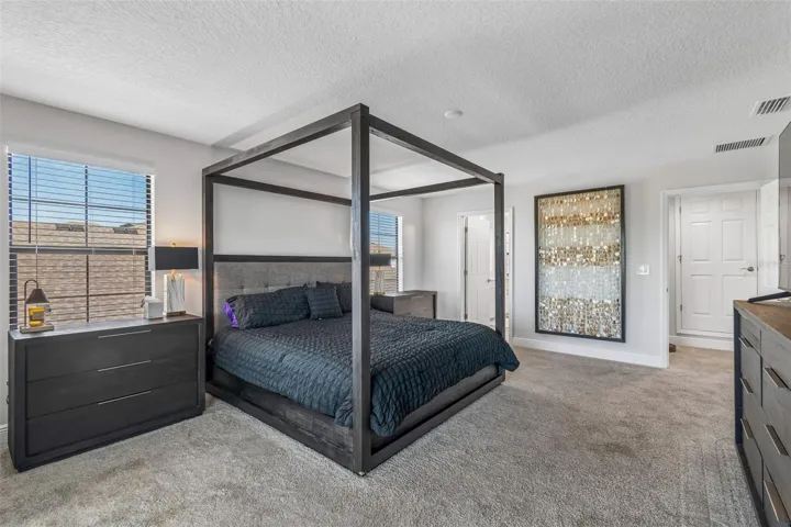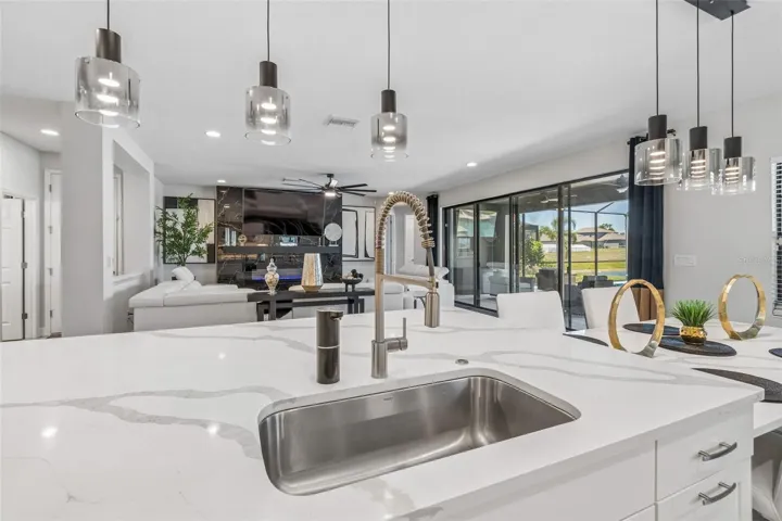 Step into a statement of modern elegance in the highly sought-after community of Triple Creek where luxury, comfort, and lifestyle come together in one exceptional, showstopping home. Built by West Bay Homes with exquisite upgrades that will astonish any buyer! Step through a grand entryway with a 2-story ceiling and striking modern chandeliers that immediately set the tone for this designer-decorated residence. Expansive folding sliding glass doors frame the breathtaking saltwater pool and pond views, seamlessly blending indoor and outdoor living. Your dining room has a beautiful chandelier which adds to the elegance of the custom glass wine display that sets the tone for all family gatherings. A chef-inspired gourmet kitchen with upgraded Sonoma linen coastal cabinetry with Calcutta Novello Quartz countertops, which will captivate all your family and friends. Your gourmet kitchen also boasts sleek, modern SMART appliances, including a state-of-the-art remote-controlled range hood. Custom designer pendant lighting and under-cabinet illumination elevate the clean elegance and stylish function throughout the kitchen. The open-concept layout flows effortlessly into the family room, where tranquil water views create a serene backdrop. Step outside to your private resort-style oasis featuring a saltwater pool with a trendsetting custom light show outlined with upgraded Mansard tiled pavers surrounding this beautiful pool, and lush tropical landscaping. The large downstairs guest suite has a beautiful bath adjacent, perfect for a cherished guest or a quiet suite for the in-laws. Upstairs the primary suite is a true retreat, offering private outdoor access to the upstairs screened balcony. The spa-inspired master bath with floor-to-ceiling tiled shower and seamless glass enclosure completes your relaxation oasis. The expansive bonus room is ideal for a media room, play area, or second living space which will bring your entire family together. The bonus room is highlighted with a dual TV setup perfect for movie nights or watching multiple sporting events at once. This room also provides access to an expansive screened balcony that stretches the length of the home—perfect for relaxing evenings overlooking the water while watching Florida’s amazing sunsets. A convenient second-floor laundry room adds everyday ease as well. Some additional key features: 5 spacious bedrooms /4.5 luxurious bathrooms/3 car garage; Elegant French doors leading to a dedicated home office; Pool bath with modern designer finishes; custom designed fireplace with porcelain tile; 3-car garage with epoxy flooring. Upgraded lighting and recessed fixtures throughout the home. Pavered driveway and enhanced landscaping with a modern irrigation system. A home water softener as well. Residents of Triple Creek enjoy resort-style amenities including multiple pools, fitness centers, playgrounds, walking trails, basketball courts, and a vibrant, master-planned community. The home is also zoned for highly regarded schools, including Dawson Elementary School, Barrington Middle School, and Sumner HS. This house will not last long so schedule your private showing today and experience the lifestyle you have always wanted within this exceptional home.
