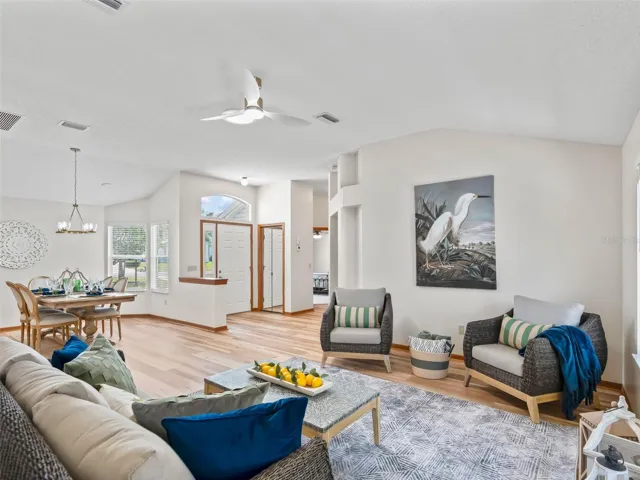 Wow! CHARMING, MOVE-IN READY 2/2 plus office Coronado MUST SEE home offers BRIGHT, AIRY, spacious floor plan in PRIME LOCATION!!! NO BOND!!! New luxury vinyl flooring and high ceilings greet you as you walk into the living room/dining room combo perfect for entertaining. Cooks will love the large kitchen with QUARTZ COUNTERTOPS and beautiful OAK CABINETRY. From your kitchen step into the office/florida room to your private deck where you can enjoy your morning coffee or afternoon cocktail. HOME IS NESTLED BETWEEN 2 GOLF COURSES (Mira Mesa & Chula Vista) just 4 minutes to nightly entertainment, dining and boutique shopping at Spanish Springs Town Square and 3 minutes to the preferred Chula Vista recreation area equipped with pickle ball courts, pool, tennis courts, bocce and beach tennis. Retail shopping on 441, Lake Sumter Marketplace Square, Spanish Plaines Medical Center and UF Hospital are minutes away.