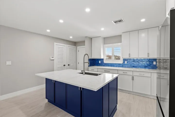 The heart of the home is a stunning, modern kitchen designed for both everyday living and entertaining. Outfitted with 42-inch solid wood cabinetry, full-extension dovetail drawers, soft-close hardware, quartz countertops, stainless steel appliances, and a tasteful contrasting island, it seamlessly flows into the living space. A blue glass tile backsplash and closet pantry add both style and functionality.