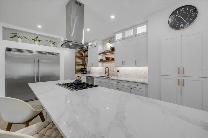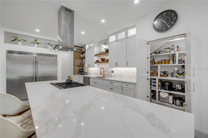 At the heart of the home, the kitchen and great room deliver undeniable impact. Designed for both entertaining and everyday living, the chef’s kitchen features Café appliances, an Electrolux double-door fridge/freezer, 42-inch custom cabinetry, a hidden walk-in pantry, and a dramatic 12-foot island that anchors the space. Oversized windows flood the interior with light, while wood accents bring warmth to the modern palette.