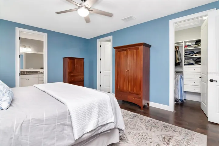 Upstairs, a spacious loft provides flexible living space—ideal as a media room or recreational area. The primary suite offers two walk-in closets with custom built-ins The en-suite bath has a large soaking tub, separate shower, and granite countertops. The secondary bedrooms are generously sized and features built-in closets, sharing a well-appointed bathroom with granite countertops.