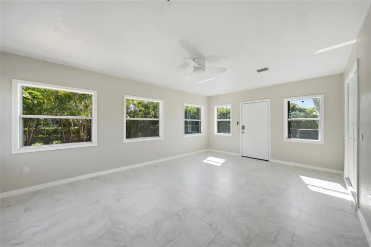 The family room captures great views of the canal, bringing natural light and the waterfront setting into your everyday living space. The primary suite is spacious, featuring a large walk-in closet with built-ins and a renovated bathroom with a tile walk-in shower and full tile walls, designed with a light and bright aesthetic. The guest bathroom was also updated in 2021, maintaining a consistent, modern feel throughout.