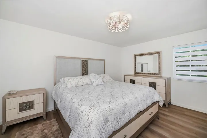 The split-bedroom floor plan centers around a zen-inspired primary suite featuring a walk in dressing room with spa shelving, and a luxurious ensuite bath with dual sinks and well designed walk in shower. The second guest bedrooms is generously sized, neutral toned colors, and outfitted with a stylish ceiling fan and a generous closet, perfect for welcoming visitors to unforgettable stays sharing an upscale modern middle bath with the rest of the home.