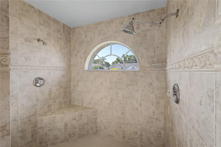 The primary suite is a true retreat, featuring tray ceilings, ceiling fan, built-in speakers, private access to the lanai, and an enormous walk-in closet with attic access. The ensuite bathroom includes dual sinks with separate vanities, a private water closet, linen closet, and a walk-in tiled shower with dual showerheads, seating, and a window for natural light.