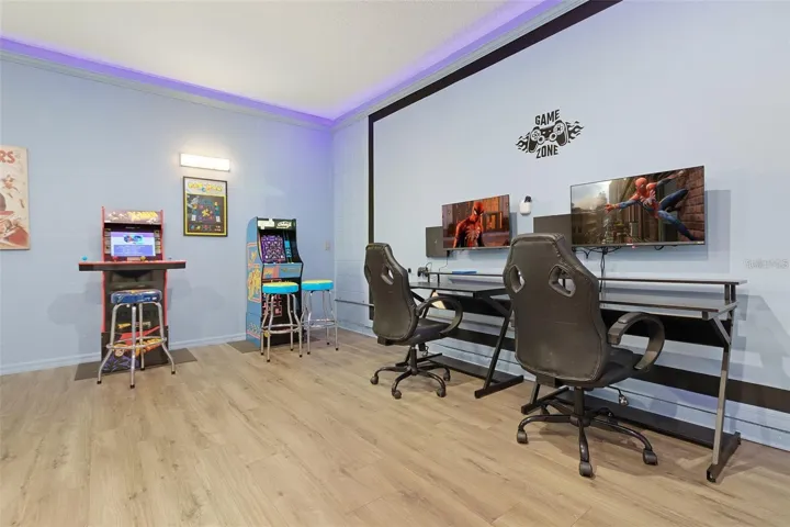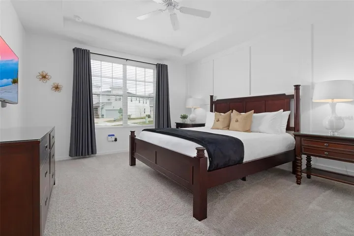 THIS IS NOT ANOTHER FURNISHED HOME, LISTEN!! LOCATED IN A PRIVATE CUL DE SAC, BEAUTIFUL POND VIEW, HEATED POOL AND SPA… LOCATION AND PRIVACY BRINGS YOU MORE VISITORS!! Welcome into this FULLY FURNISHED, *9 BED / 6.5 BATH* SINGLE FAMILY POOL HOME nestled in one of the most sought-after STR GATED VACATION COMMUNITIES in the Disney area: **SOLARA RESORT**. This home has 4403 Sqft under AC and is an OPEN CONCEPT design, filled with natural light and a breathtaking POND VIEW. In addition, the Garage is air conditioned and converted into a GARAGE PLAYROOM that has hours of fun instore. On the main floor, the Kitchen flows into the DINNING ROOM, GAME SPACE and GREAT ROOM then opens to the oversized SCREENED LANAI and SOUTH facing HEATED POOL and SPA with large sliding pocket glass doors. The LANAI SEATING AREA offers a privacy screen. This customized home includes 2 MASTER SUITES (one up one down), 3 upstairs PODS with a child-themed room (MICKEY MOUSE, AVENGERS + STAR WARS) connected to an adult bedroom by a full bath. There is also a FROZEN PRINCESS room next to the full hall bath. All furnishings are approximately 1 yr old and in like new condition. All adult king beds have Sealy Posturepedic mattresses and all hard surface furniture have glass tops added to prevent guest damage. The garage playroom has both a foosball table and fun size basketball game. For the arcade fans in the family, they will find arcade games, no coins needed! The gamers can sit back and enjoy the side-by-side PlayStation 4 gaming stations with wall-mounted tvs. There is surely something for everyone in this adventurous room! Within just minutes from Orlando world-famous theme parks and attractions, this community has an extensive list of amenities, from an on-site restaurant and coffee bar to a zero-entry pool, pool bar, fitness center, basketball court, soccer field, volleyball court, gaming stations, playground, splash pad, waterslides and Flowrider.