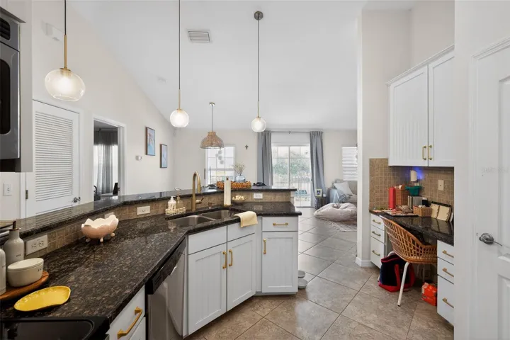 Inside, you’ll find an open floor plan with 12-foot vaulted ceilings that create a bright and airy feel throughout the main living areas. Natural light fills the space, complementing the ceramic tile flooring that adds both style and easy maintenance.