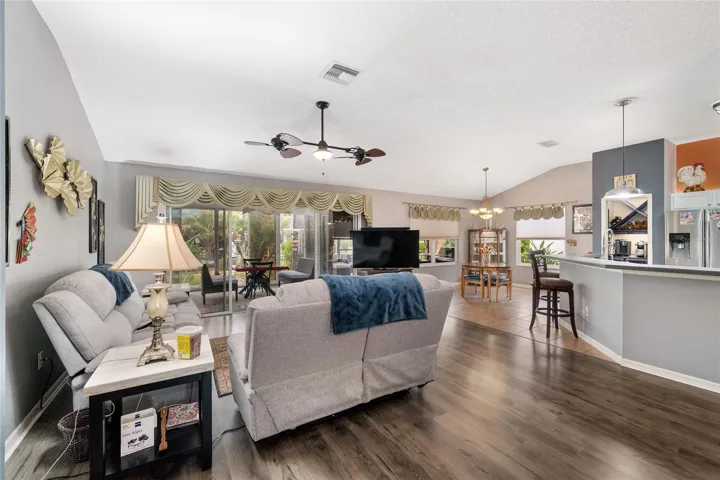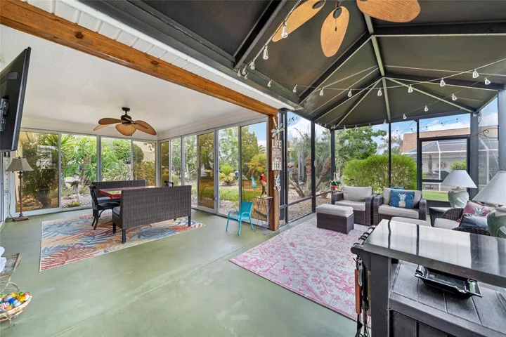 Step outside to enjoy year-round Florida living with an ENCLOSED LANAI featuring ACRYLIC WINDOWS and A/C VENTS CONVERTED INTO MORE OF AN OUTDOOR SPACE WITH AN EXTENDED COVERED BIRDCAGE—perfect for relaxing or entertaining in a PRIVATE, LUSHLY LANDSCAPED setting.