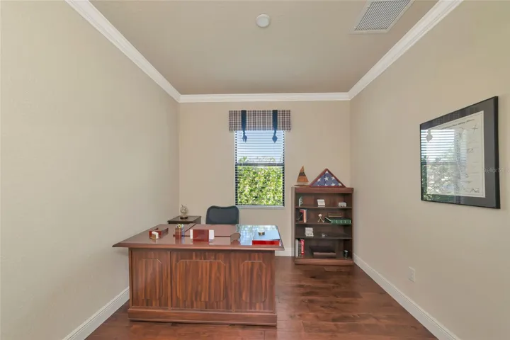 What if your next home came with ample space to live and a resort lifestyle right outside your door. This home in River Strand Golf and Countru Club in Heritage Harbour deserves your attention. The thoughtfully designed residence features an open floor plan ideal for entertaining. The kitchen with custom woodwork and backsplash overlooks the dining and great rooms. A den with double doors is versatile and the perfect spot for a private office, study, or a flex room suit your needss. Hardwood floors add warmth to the main living areas and den. Upgrades include added base and crown molding, newer carpet in bedrooms, custom closets in a guest bedroom and hall, a motorized sunshade, and a NEW AIR CONDITIONER installed in March 2026. Bedrooms are split offering true privacy. The primary bedroom comes with two walk-in closets and large bath with soaking tub, separate shower and private commode. Guest bedrooms have their own full baths, one with a walk-in shower with frameless glass doors. Set on a desirable lot with tranquil green space views, this home offers added privacy with no neighbors to one side and off the rear lanai. Beyond the home itself, the community delivers a true resort-style experience with amenities that appeal to a wide range of interests. Enjoy multiple pools, state-of-the-art fitness centers, pickleball and tennis courts, and a full calendar of social activities. Golf enthusiasts will appreciate the flexibility of pay-per-play access upon availability for Social Members offering the enjoyment of the game without full-time commitment and expense. Just completed is a multi-million dollar renovation of the Clubhouse, Dining Venues and outdoor Terrace. A 24-hour guard gated entrance with roving security adds to peace of mind. An urgent care center is within Heritage Harbour. Also within Heritage Harbour the Marketplace continues to expand. Costco, Target, Hobby Lobby, Aldi and multiple restaurants are in place with much more to come. A short drive away are I-75, Lakewood Ranch, University Town Center and those inviting Gulf beaches.