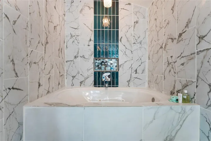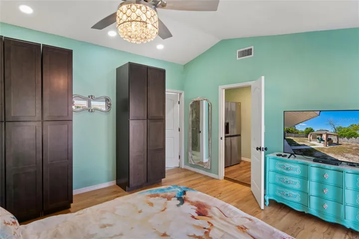 Retreat to your private primary suite with vaulted ceilings, a statement chandelier-style fan, and custom wardrobe cabinetry. The spa-like primary bathroom is a true showstopper, featuring a two-person jetted Jacuzzi soaking tub with dedicated heating, a tankless water heater for endless hot water, a walk-in shower with glass wall divider, a double vintage wood vanity, and a custom storage armoire, delivering a true luxury bathroom experience.