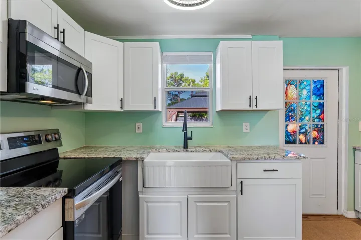 The heart of the home is a stylishly redesigned kitchen featuring modern white cabinetry, granite countertops, a large porcelain farm sink, and stainless steel appliances (2024), creating the perfect space for entertaining and everyday living.