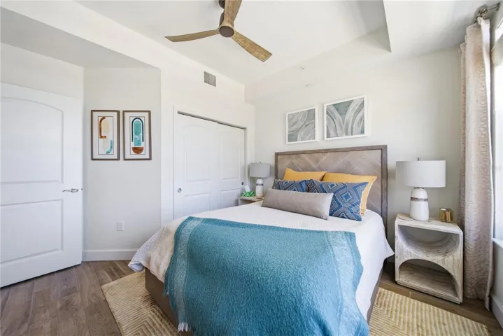 Its spa-inspired bath features dual sinks, stone countertops, and an oversized walk-in shower with frameless glass enclosure.