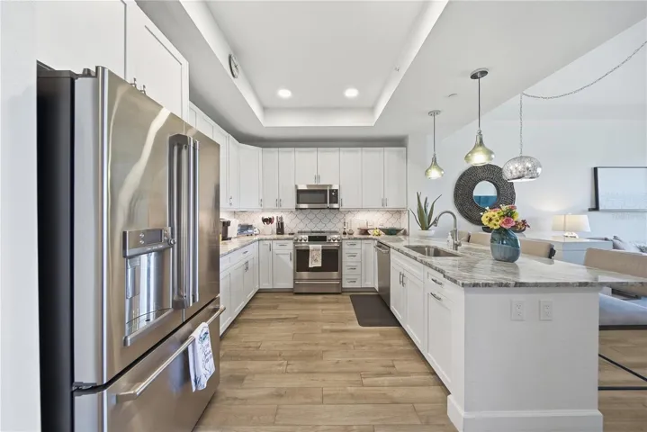 The sophisticated kitchen is both stylish and functional, featuring stone countertops, GE Café stainless steel appliances, under-cabinet lighting, and abundant workspace for entertaining.