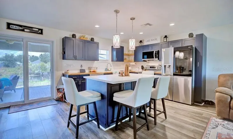 CANAL HOME living at its finest!! Built in 2023 by the current owner, this newer construction home was thoughtfully designed with quality in mind and no expenses were spared. Situated on a canal with direct access to beautiful Lake June, this property offers both modern living and a true Florida waterfront lifestyle. A covered, screened front porch welcomes you into the home, while the interior showcases wood-look luxury vinyl plank flooring, wood cabinetry, and a clean, modern aesthetic throughout. The kitchen is both functional and inviting, featuring a concrete island, stainless appliances, and a dedicated coffee bar, making it ideal for everyday living and entertaining. The split floor plan provides a spacious guest bedroom and a large primary suite with an oversized walk-in closet. Storage is abundant, including a utility room with interior storage and additional built-in storage areas. Constructed with durability and efficiency in mind, the home includes a metal roof, impact-rated windows, AC, and septic system. Outdoor features include a detached 18×20 garage/workshop giving you extra storage for a car or boat, paved areas, a screened rear porch, and mature landscaping, offering peaceful canal views and easy access to the lake. Additional highlights include stainless steel appliances, washer and dryer, and a layout designed for comfort, function, and long-term value. Whether you’re enjoying quiet mornings by the water or heading out to Lake June for boating and fishing, this move-in-ready home delivers quality craftsmanship and an exceptional setting.