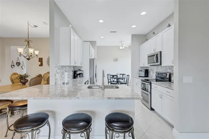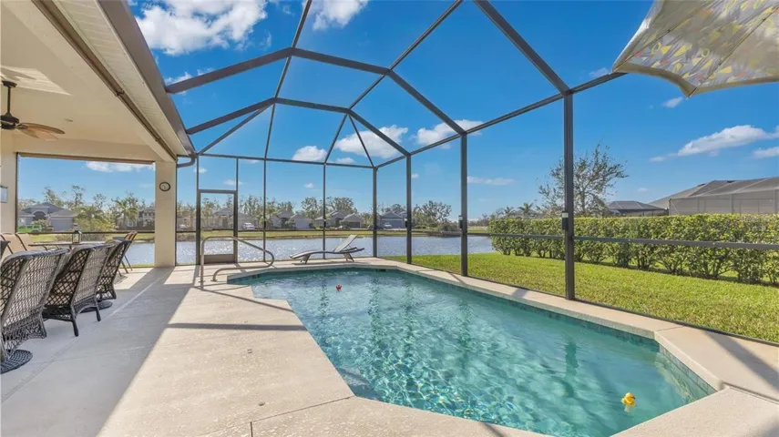 Designed for the Florida lifestyle, the screened-in pool area and covered lanai are set up for year-round enjoyment, complete with sunny southern exposure, a mounted TV, and custom pull-down shades.