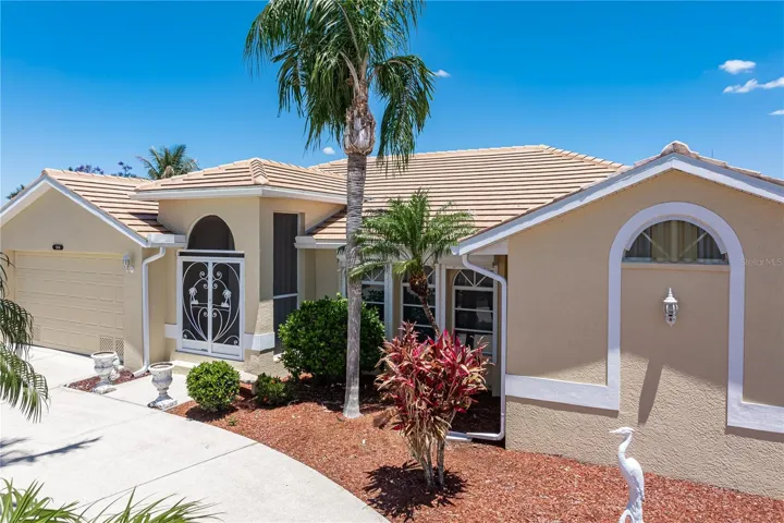 PGI WATERFRONT HOME W/**NEW ROOF**, QUICK SAIL ACCESS & INTERSECTING CANAL VIEW! Check out this 3 bed/2.5 bath, waterfront home in Punta Gorda Isles with quick, sail access and 79ft of seawall. Enjoy a lovely view of intersecting canal views combined with an eastern rear exposure that guarantees colorful sunrises over the water. Reach open water from your private, backyard dock in 10-15 minutes!! Inside, the home features a bright, open layout w/a formal living room and dining room, central kitchen & separate family room. Architectural details include cathedral ceilings, wood-look luxury vinyl plank flooring in main living areas, arched windows at front of home & tons of natural light. Kitchen offers granite countertops, ample cabinet/counter space, a breakfast bar, and a pass-through window to the lanai for easy indoor/outdoor entertaining. The split-bedroom floor plan provides privacy for owners and guests alike. Private master suite offers two walk-in closets, walk-out access to the lanai and en-suite master bath. Guest bedrooms are located off the family room – a pocket door separates them from the rest of the house giving your guests true privacy. Guest rooms both feature large, walk-in closets. One guest room has walk-out access to the lanai w/a pool & canal view. Guest bath doubles as a pool bath w/access to the a lanai. Three sets of disappearing sliding glass doors open to the lanai extending the living space outside for true, Florida-style indoor/outdoor living. The lanai boasts a large, in-ground, heated pool. A hot tub nestled in the corner of the lanai is the perfect way to unwind after a long day. A concrete dock w/10,000 lb boat lift is steps from the back door. Boat lift includes walk-around platform allowing easy boarding, cleaning and maintenance. Water and electric hook-ups are available dockside. Updates include NEW roof (2024), NEW pool heater (2024), & NEW A/C (2020).Other amenities include whole-house hurricane protection, an attached two-car garage, circular driveway and well-maintained tropical landscaping. Home is located in on a quiet cul-de-sac. Miles of connected sidewalks link you to all of Punta Gorda Isles. Just minutes away are Fishermen’s Village, downtown Punta Gorda, St Andrews South Golf Course, Sunseeker Resort, waterfront parks, marinas, shopping, and dining. Punta Gorda also features a vibrant art & music scene w/numerous festivals, farmer’s markets & craft fairs throughout the year. Come find out why Punta Gorda is consistently named one of the best places to live in Florida. Schedule your showing today.