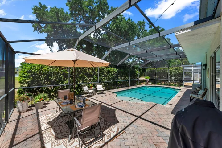 The kitchen is designed for both function and gathering, featuring extensive cabinetry, multiple pantry closets, generous counterspace, a center island, stainless steel appliances, and a large eat-in dining area. Sliding glass doors from both the kitchen and family room open to the screened-in pool and paver lanai, creating a true indoor-outdoor Florida living experience.