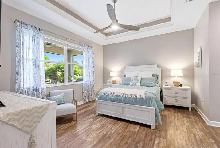Welcome home! Step inside this immaculate, move-in ready Lee Wetherington home, where warmth and elegance embrace you at every turn. With 3 bedrooms, 2 full baths, and a 2-car garage, this meticulously maintained residence will captivate you with its dramatic details including gorgeous tray ceilings, crown moldings, and a stunning built-in wall unit with an electric fireplace. The plantation shutters, wood-look tile floor, upgraded light fixtures, and designer fans add a touch of sophistication to every room. Indulge your inner chef in the kitchen with neutral Corian countertops, a new extra-large stainless sink, and top-of-the-line Whirlpool stainless steel appliances. The well-designed split floor plan, complemented by pocket doors, provides complete privacy for both owners and guests, while the open combination living and dining room is the perfect space for gatherings and creating cherished memories. Step through the sliding doors onto the oversized screened lanai where a tranquil pond view awaits you. Indulge in ultimate comfort in the spacious master ensuite which boasts a sizeable shower, double sinks, and an enormous walk-in closet. This home has been thoughtfully updated and meticulously cared for. The exterior was painted in 2019 and the interior received a fresh painting in 2021. The kitchen appliances were purchased in 2019, along with the installation of a tankless water heater. The A/C was replaced in 2017, ensuring optimal efficiency. Recent additions include a Kraus stainless sink and a no-touch faucet in 2021, bathroom faucets in 2021, an Alert 360 security system in 2020, as well as newly installed light fixtures and designer fans in 2021. The wall unit with fireplace was also added in 2021, enhancing both style and comfort. Surrounded by lush tropical landscaping, picturesque lakes, and a public golf course that requires no membership, this home offers the perfect balance of natural beauty and convenience. The low annual HOA fee and the affordable $140 monthly landscaping fee provide peace of mind and a hassle-free lifestyle. Enjoy the convenience of proximity to highways, airports, shopping, dining, and the stunning beaches of the area. Within walking distance, you’ll find the community pool, clubhouse, golf, tennis, and pickleball courts, offering an active and vibrant lifestyle. Don’t miss this opportunity to own this extraordinary home that provides the epitome of elegance, comfort and convenience.