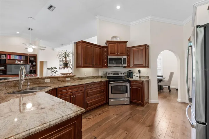 Step outside to enjoy your screened-in pool, perfect for relaxing or entertaining in a peaceful, private setting surrounded by mature trees. While the home is situated on the golf course, the lush greenery creates a secluded atmosphere without direct visibility from the house.