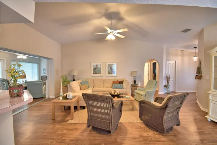 Welcome to this beautiful well-maintained 2 bedroom/ 2 bath fully furnished home located in the desirable Lake Henry Estates 55+ community. Charming brick and stucco exterior, and spacious front entry. The kitchen provides plenty of cabinet storage and counter space, perfect for everyday living. Home features laminate flooring throughout, offering both style and easy maintenance. The vaulted ceilings is a nice touch making home feel extra large. Both bedrooms are large and master features a walk-in closet, private bath, dual sinks, garden tub and separate shower. Enjoy peace of mind with many updates including new windows throughout(3yrs old), roof (2yrs old),washer and dryer (2ys) and Ac unit 5 years. The beautiful paver driveway adds exceptional curb appeal. Lake Henry Estates offers outstanding amenities including a community clubhouse, storage area, fitness center, golf course, swimming pool, tennis, boat dock, and private boat launch, everything you need to enjoy the Florida lifestyles. Conveniently located near shopping, medical clinics, hospitals, HWY 27 and I-4. Easy access to Tampa, Orlando, beaches & attractions. Come experience easy living in this wonderful active adult community! Call today to schedule a private showing!!!