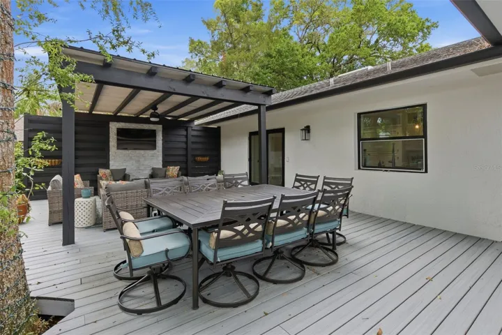 This light and bright, single-story, almost 3,000 square foot pool home features a split plan with four full bedrooms and three full baths. Your guests will immediately appreciate the expansive paver driveway, which allows easy, off-street parking. Once inside, they will admire the abundance of natural light provided by the new, large-format windows. Not only do the new windows (2022) illuminate the interior space, but they are also impact-resistant, energy-efficient, noise-reducing, and offer UV protection. The interior renovation was designed with minimal barriers between living areas, creating open, fluid spaces that enhance day-to-day living. The bedroom and bathroom layout is ideal, offering maximum privacy: two large bedrooms share one full bathroom on one side of the house, another bedroom with an en-suite bathroom is at the center, and the primary bedroom and bathroom are on the other side. Wood or natural stone flooring, extensive millwork, vaulted ceilings, new paint, updated lighting fixtures, and new fans enhance the spaces throughout. The kitchen was renovated to include an oversized, under-mount farmhouse sink, commercial-grade faucet, new LED lighting, and quartz countertops with a waterfall edge. The primary suite was updated by a former owner but was renovated by the current owner to add a second walk-in closet with custom organization. All bathrooms received light renovations, ranging from hardware and paint to new fixtures or vanities and countertops. In addition to the visually appealing renovations, the roof was replaced in 2019 and the house was re-plumbed in 2020. The outdoor improvements may be the most valued, as they created endless opportunities for outdoor living and entertaining on the newly constructed deck and enhanced landscape. All of the outdoor living benefits Florida provides are available here. A natural gas line was brought to the house as part of the renovation, allowing for easy future modifications such as a tankless gas-fueled water heater or gas-fueled outdoor grill. Located just one and a half miles from the notable retail stores and restaurants of Park Avenue and within a well-graded public school zone, there is nothing you won’t love about this home or its location.
