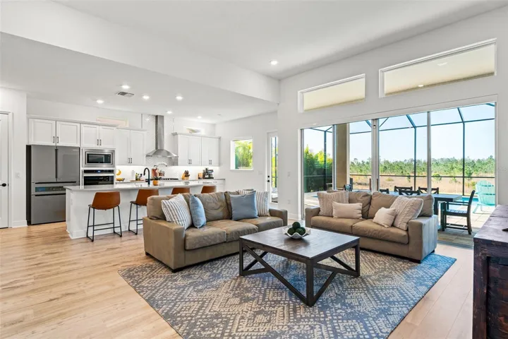 Soaring 12-FOOT CEILINGS and an abundance of natural light make the living room feel both grand and inviting. PICTURE WINDOWS above the sliding glass doors frame the backyard views while allowing sunlight to pour into the space..