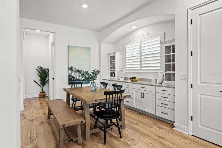 Upon entering, luxury laminate flooring guides you through the open floorplan. Just off the foyer is a private office, ideal for working from home, while the spacious dining area features a custom buffet with additional storage.
