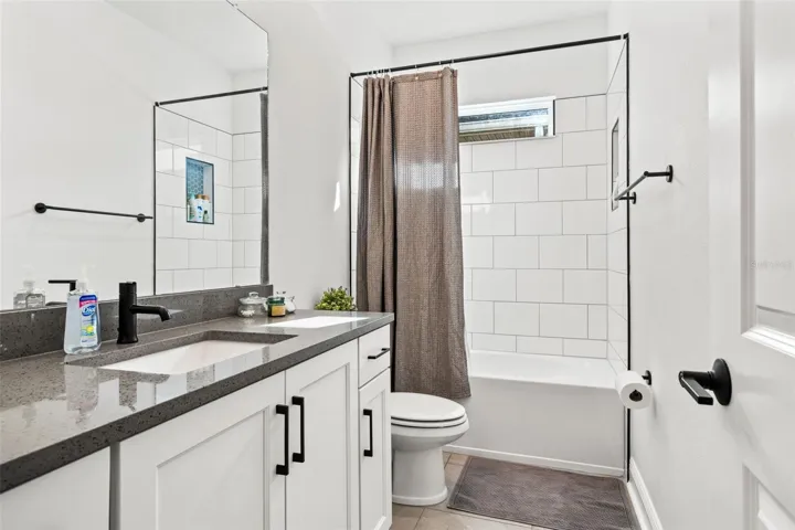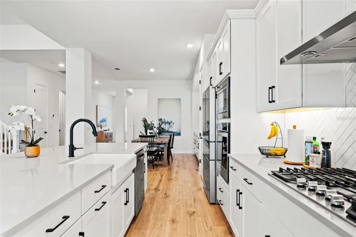 At the center of the home, the beautifully appointed kitchen showcases quartz countertops, a large island, wood shaker cabinetry with LED lighting, designer backsplash, gas range, and Whirlpool/Bosch stainless steel appliances.